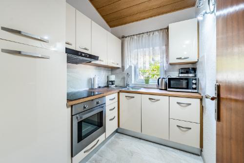 Ausstattung Küche: E-Kochplatte (4 Kochstellen) und E-Herd, Kühl-/ Gefrierschrank, Mikrowelle, Geschirrspülmaschine, Kaffemaschine, Wasserkocher, hochwertig ausgestattet (Geschirr, Besteck, Töpfe, usw.).